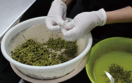 2熟す前のやわらかい実山椒を収穫し、ていねいにひとつずつ手作業で枝をとっていく