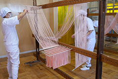 みちのく福島から、麺の匠が百年伝承の製法で丹念に仕上げた、自然の恵みと彩り豊かな麺をお届け。この地域の手延べ麺の伝統製法と技術を、職人によって現在までしっかりと受け継いできた。生地は「ねかせ」と「延ばし」(写真)を繰り返し行う手延べ製法で作り、乾燥しすぎない寒冷地の気候を生かして植物油は不使用。そのため小麦本来の風味を残すことができる。丸2日かけ丹念に一本一本のばして仕上げられており、なめらかな舌触りとのど越しの良さは格別。