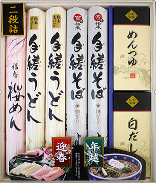 | 内容量 | 【2段詰】 手縒そば 180g×4 手縒うどん 180g×4 桜めん 180g×2 めんつゆ 30㎖×3×2セット 白だしつゆ 30ml×3×2セット 七味 5gk×1 |