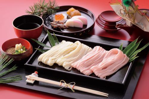 麺の匠が百年伝承の製法で丹念に仕上げました。年越そば、と紅白の麺がセットになっております、年越にはそばを年明けには紅白麺でお祝いの席を華やかに演出します。自然の恵みと彩り生きる麺を、みちのく福島からお届けします。