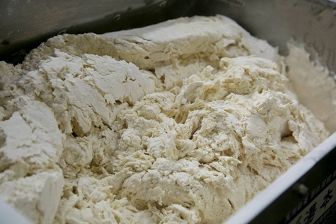 小麦粉と塩水をよく捏ね合わせて、麺のコシの強さの元であるグルテンをつくります。