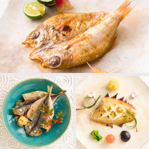 高級魚ノドグロ、脂がのったマアジ、塩干しすることで旨味が凝縮されたカレイ。三魚それぞれの特徴を引き出した干物セットです。